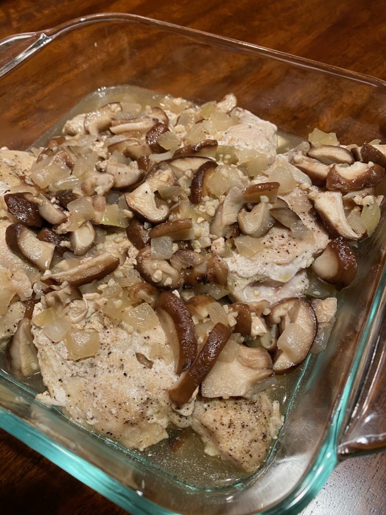 Tenderize chicken if needed. Sprinkle with salt/pepper. In a large skillet, brown both sides of chicken in oiled pan, cook until just done. Remove from pan and keep warm. Add mushrooms, and onion to pan with drippings. Cook over med – high heat until tender and lightly browned, 3-5 min. Add garlic and cook for additional minute or so. Add wine, bring to boil, stirring to loosen browned bits from chicken in pan. Cook 1-2 minutes to reduce. Can add chicken back to pan to re-warm, finish cooking or serve sauce over chicken on bed of grain of your choice.